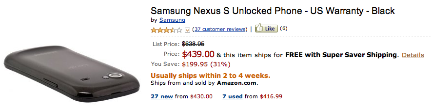 Amazon has the Samsung Nexus S 4G for Sprint “unlocked” – (but where else can you use it?) for $439 with free shipping. Theoretically, it could be used on Verizon’s 3G or even Cricket with some flashing expertise but you’ll likely want it for Sprint customers.