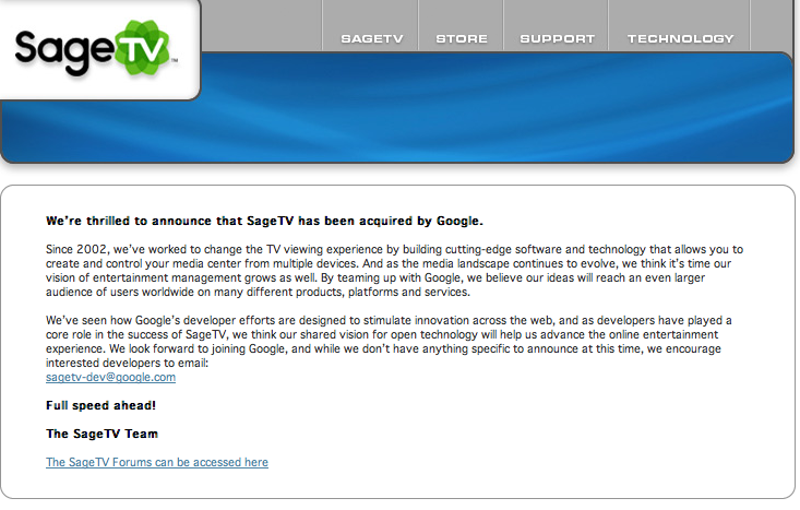 Inglewood, California-based SageTV announced on its website today that it has been acquired by Google. The rest of the site, besides forums, has been closed down and visitors with questions are encouraged to send emails to sagetv-dev@google.com.
