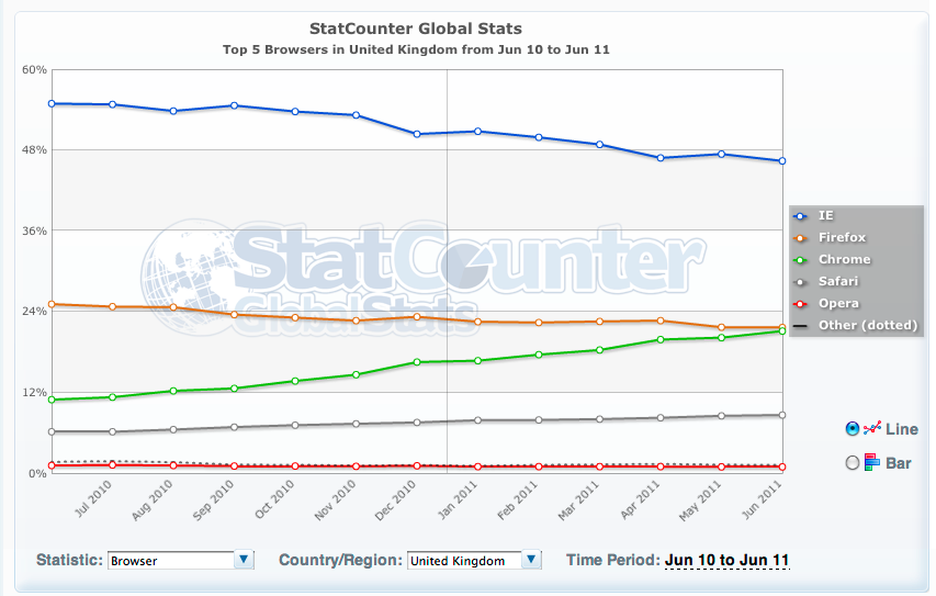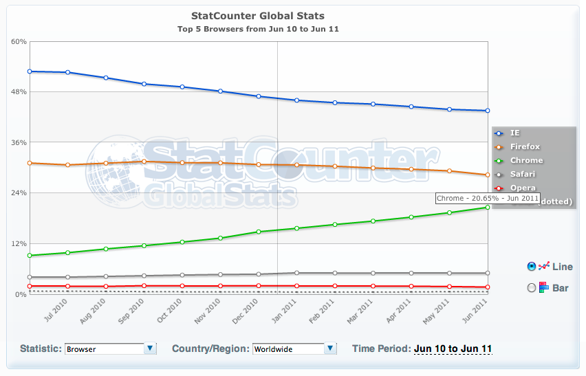 For the first time ever, Chrome passed the 20 percent mark globally, accounting for 20.65 share of all web browsing the world over. Compare that to just 2.8 percent in the year-ago period. Google’s browser is now chasing Firefox which fell from 30 percent in June 2010 to 28 percent in June 2011. All versions of Microsoft’s Internet Explorer have also fallen to 44 percent globally, down from 59 percent in June 2010.