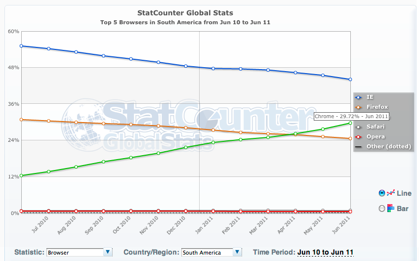 In the United States Chrome’s rise was less rapid, hitting 16 percent in June while Microsoft’s and Mozilla’s browsers scored 46.5 percent and 24.7 percent, respectively. What’s especially interesting is Chrome’s share in South America where it grabbed 29.72 percent of the market, beating Firefox (24 percent) to the browser punch (Microsoft’s browser had 44.1 percent share). An indication of things to come globally?