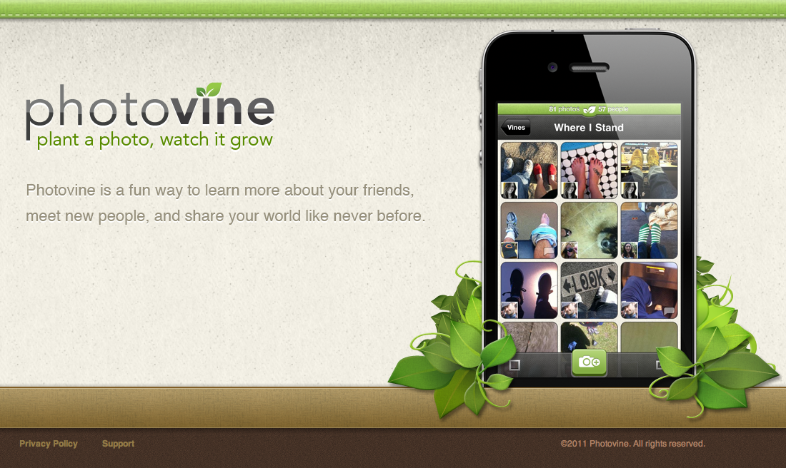 Photovine is a community that’s about creating fun and unique collections of photos that we call Vines. In Photovine, vines connect you with people through the ideas and themes expressed in your photos. A vine is like a constantly growing family of photos connected through a common caption created by you, your friends, and people all over the world. Some examples of vines could be: “What Weekends Are Made Of”, “Secret Stuffed Animal”, “Party People”, or, “Love of My Life”. As people add photos to vines, they tell their own stories about the moments, images, and ideas that define our lives in a way that’s social, creative, and fun. Start a vine by taking a photo and creating a new caption, or add to an existing vine. Other people will see your vine and join in by adding their own photo, showing their own take on the caption.