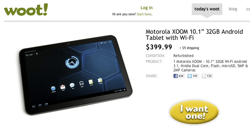 Want an Android 3.2 tablet and don’t want to shell out a lot of coin? Today Woot! has the refurb XOOM 32GB Wifi for $399+ $5 shipping.