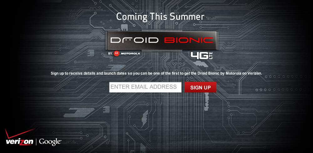 Verizon has launched a sign-up page for their upcoming Motorola LTE phone, the Droid Bionic. The Bionic was announced at CES in January, but had some flaws that needed ironing out. On the sign-up page Verizon says the phone will be available this summer (which is half over already). We reported August 4th could be the launch date — could this still be the case? Head over to Verizon to sign-up and get updates, or just stick to NewGeekGuide.