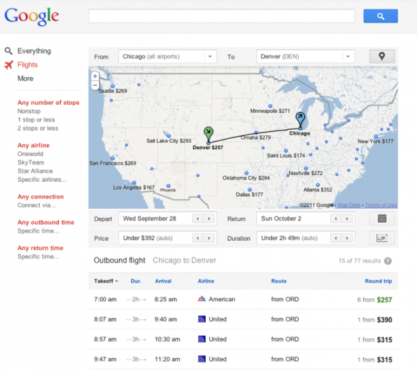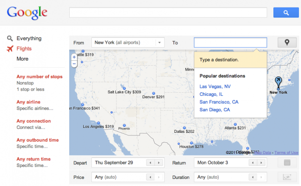 Google has launched Travel search which will debute across select cities today. The new search is the first product to emerge from ITA, a company Google acquired in April. The new Travel search uses similar methods that you’re used to in traditional Google search. As you can see, a simple search like “flights from New York to San Francisco” returns results under the “flights” category.