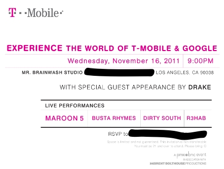 The event is most definitely looking to be the launch of Google Music. Look at all of those music artists (for the after party) in the invite: Drake, Maroon 5, Busta Rhymes, Dirty South, and R3hab are certainly some big names. However, it’s not clear what T-Mobile’s roll will be, but a Galaxy Nexus version could certainly be possible.