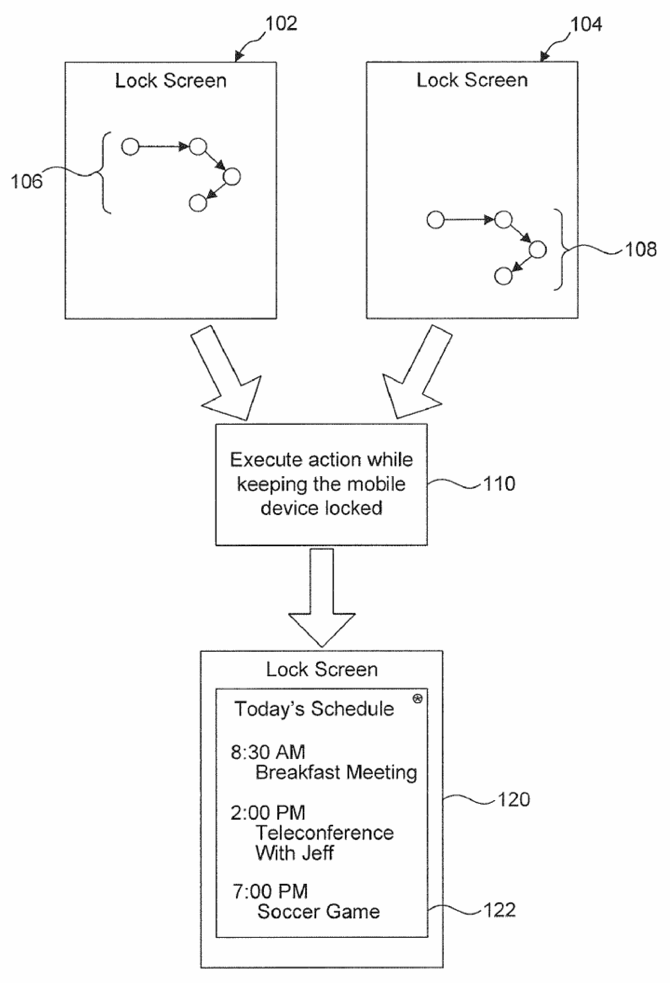 The patent goes on to detail custom gestures which can be drawn anywhere without even looking at the lock screen, allowing you to quickly access certain functions while keeping the device locked, like with HTC’s Sense 3.0 software shown in the below clip. Google explains custom gestures can be used to, say, silence the device while keeping it discretely hidden from view.