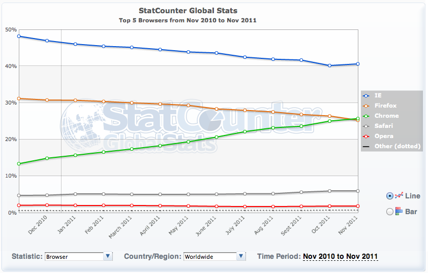 According to November 2011 browser usage data collected by Global StatCounter, a mobile analytics service tracking three million web sites, Google’s Chrome browser has finally surpassed Mozilla’s Firefox on the global scene. Chrome also overtook Firefox in the United Kingdom back in July, but Mozilla’s software retained its lead over Google in the United States as of November 2011. Based on aggregate data collected on a sample exceeding 15 billion page views per month (four billion from the United States), Chrome had a global web browsing share of 25.69 percent in November 2011 versus Firefox’s 25.23 percent.