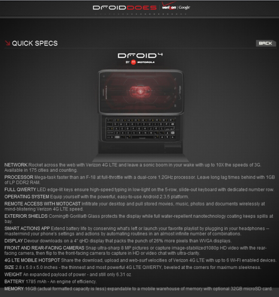 The answer to the question of “what would happen if you slapped a keyboard on the back of a Droid Razor” just showed up for a brief moment on Verizon’s DroidDoes website. The Droid 4 “only” has a 4-inch screen compared to the RAZR’s 4.3″ but pretty much everything else lines up the same. Perhaps more importantly, yes, that is a 5 row keyboard (4 rows is for suckers) and of course the speedy LTE comes along too. DOES below.