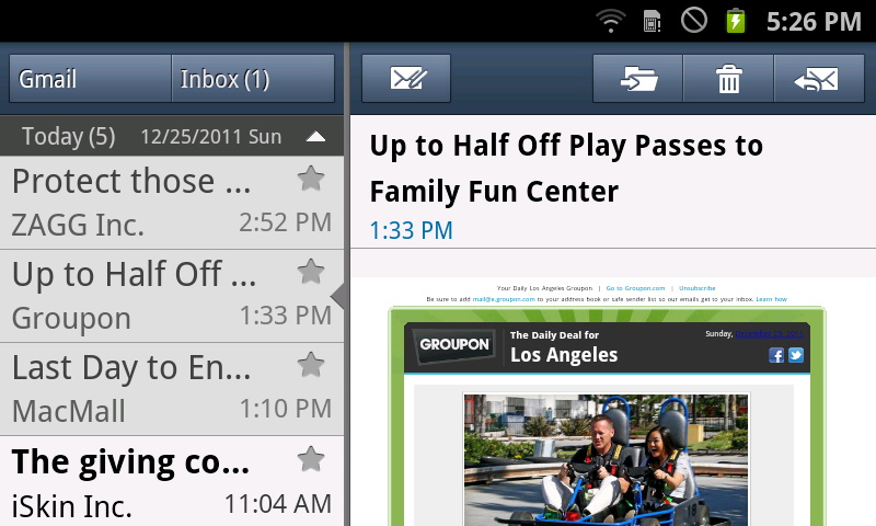 The display can make or break a product, as it is the window into your content. With the iPhone’s super high resolution Retina Display, some have said that screen size does not matter, but it is the resolution that matters. This may be true when comparing the iPhone to some other phones with bigger display sizes, but when it comes to the Skyrocket, the Skyrocket’s display is superior to the iPhone’s Retina Display. The screen is not only extremely clear to the human eye, but its size allows for some neat software features. The bigger screen not only places more applications in front of you on the home grid, but also allows you to be more productive in apps like the web browser, where you can obviously see more content. The true marvel, though, as you can see above, is applications that take unique advantage of the screen size. This is best shown in the e-mail application, which in landscape uses a split mail view like the iPad. For its much larger size, and ability to keep a clear resolution, the Skyrocket has a fantastic display.