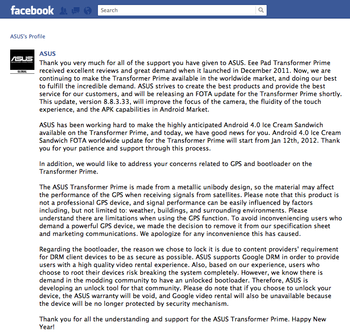 “Eee Pad Transformer Prime received excellent reviews and great demand when it launched in December 2011,” said the company in a Jan. 3 Facebook post. “ASUS strives to create the best products and provide the best service for our customers, and will be releasing an FOTA update for the Transformer Prime shortly.”