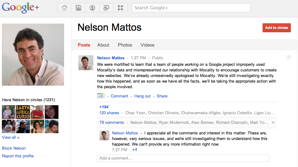 Europe and Emerging Markets Product and Engineering Vice President Nelson Mattos released a statement through Google + regarding the poaching scandal: