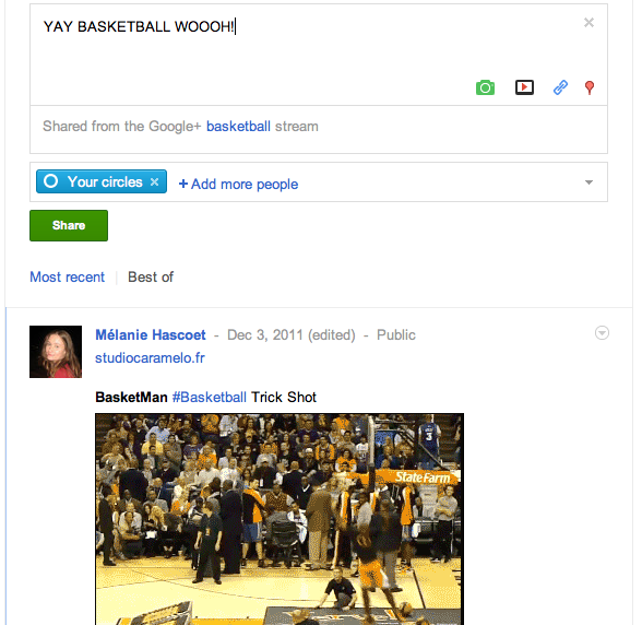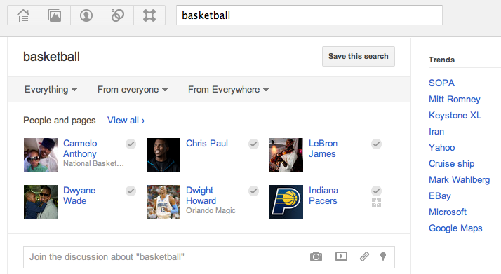 “For example, if you search for basketball and then want to make a post about how your favorite team or player is doing, you can share right from the search results. Just look for the sharebox after searching on Google+, and you’ll see an opportunity to ‘join the discussion’ about whatever you’ve searched for.”