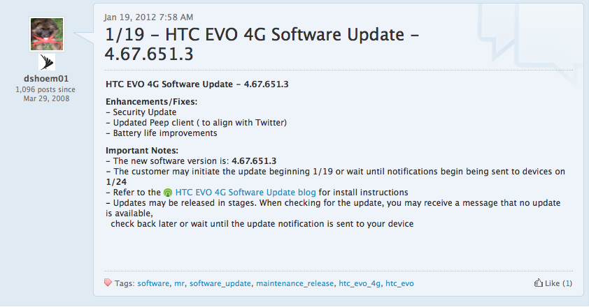 Sprint’s latest change log rollout for the HTC EVO 4G officially began Jan. 24, and it features Carrier IQ removal, peep client updates, and battery life improvements (visit the HTC EVO 4G Software Update blog for install instructions).