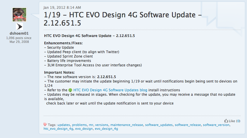 The HTC EVO Design 4G Sprint update also began Jan. 24, and it highlights Carrier IQ removal and peep client updates, along with Sprint Zone client updates, 3LM Enterprise Tool Access with no user-interface changes and improved battery life (visit the HTC EVO Design 4G Software Update blog for install instructions).