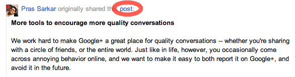 Last but not the least, as of recently, users can now get a direct URL of any public Google+ post just by clicking the “post” link. Previously, they would have to click on the timestamp, which did not appear as a hyperlink (though it was). By making these direct links more prominent, Google is hoping many more people will refer to Google+ content in their blog posts.