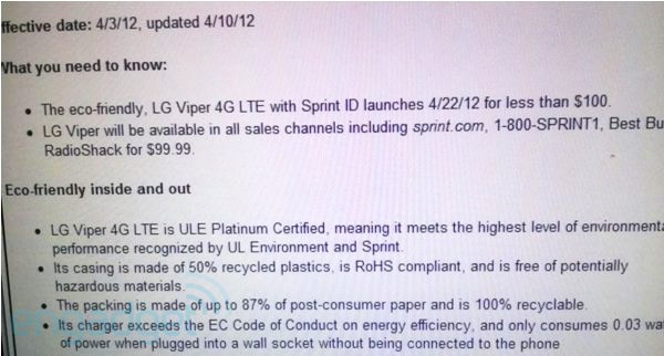 The launch of Sprint’s first LTE handset may not be that far off. Engadget obtained an internal memo at Sprint that details the launch of the LG Viper 4G. According to the leak, the Viper 4G will land over on the Now Network April 22 for less than $100. Of course, Sprint’s LTE network is not live, and there is no word on when the carrier plans to make it available. If you purchase the Viper 4G, you may be without 4G for a few weeks months. However, remember that pre-orders for the device begin tomorrow on Sprint’s website. You can check out the leaked memo after the break.
