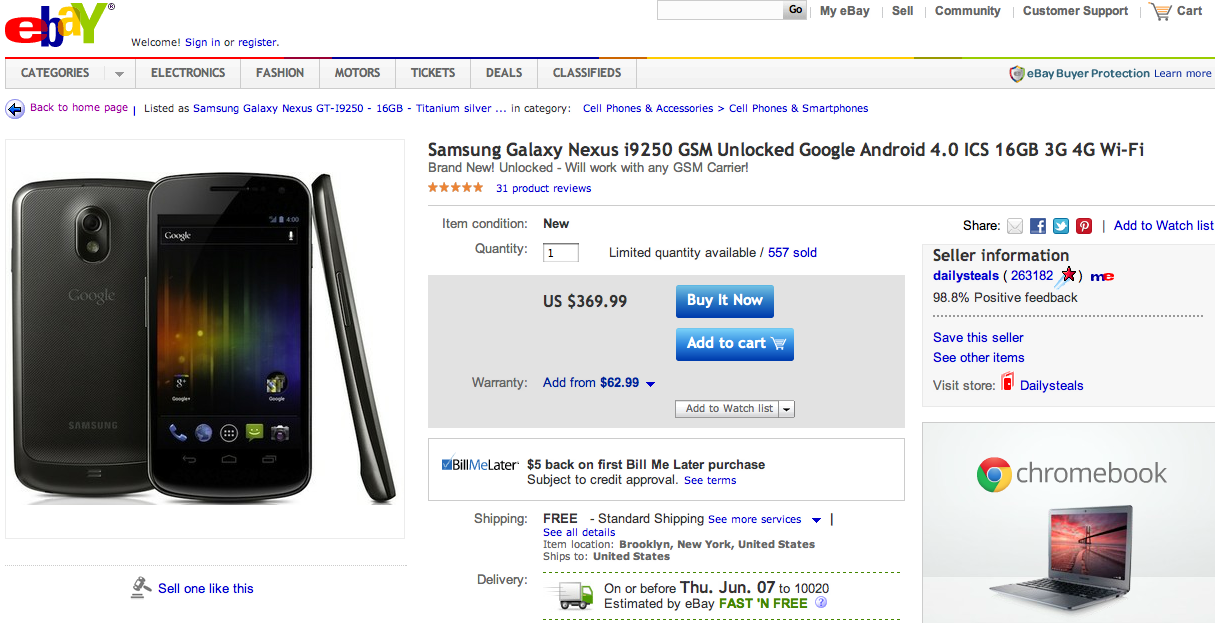 It works on any GSM Carrier and sports Android 4.0, a 1.2 GHz dual-core processor, 5 MP camera, an 1850 mAh battery, a 4.65-inch HD Super AMOLED display, as well as 4G (LTE or HSPA+) connectivity. The deal expires soon, but it includes free shipping and an additional $63 two-year warranty. Furthermore, eBay promises it will arrive at your doorstep on June 7 if bought today.