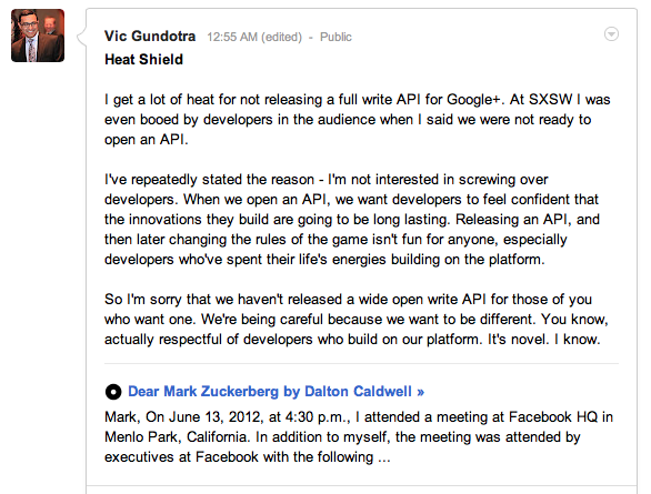 Google Vice President of Engineering Vic Gundotra noticed Caldwell’s contentious blog post late last night, so he promptly explained in a status update why a public, read-and-write Google+ API is missing in action. His answer is simple: “I’m not interested in screwing over developers.”