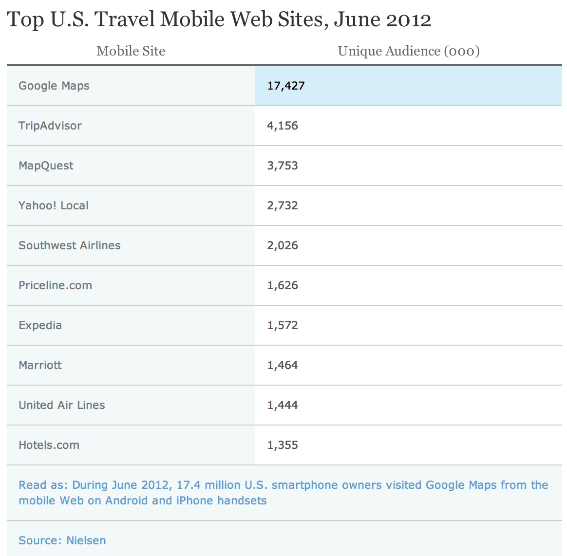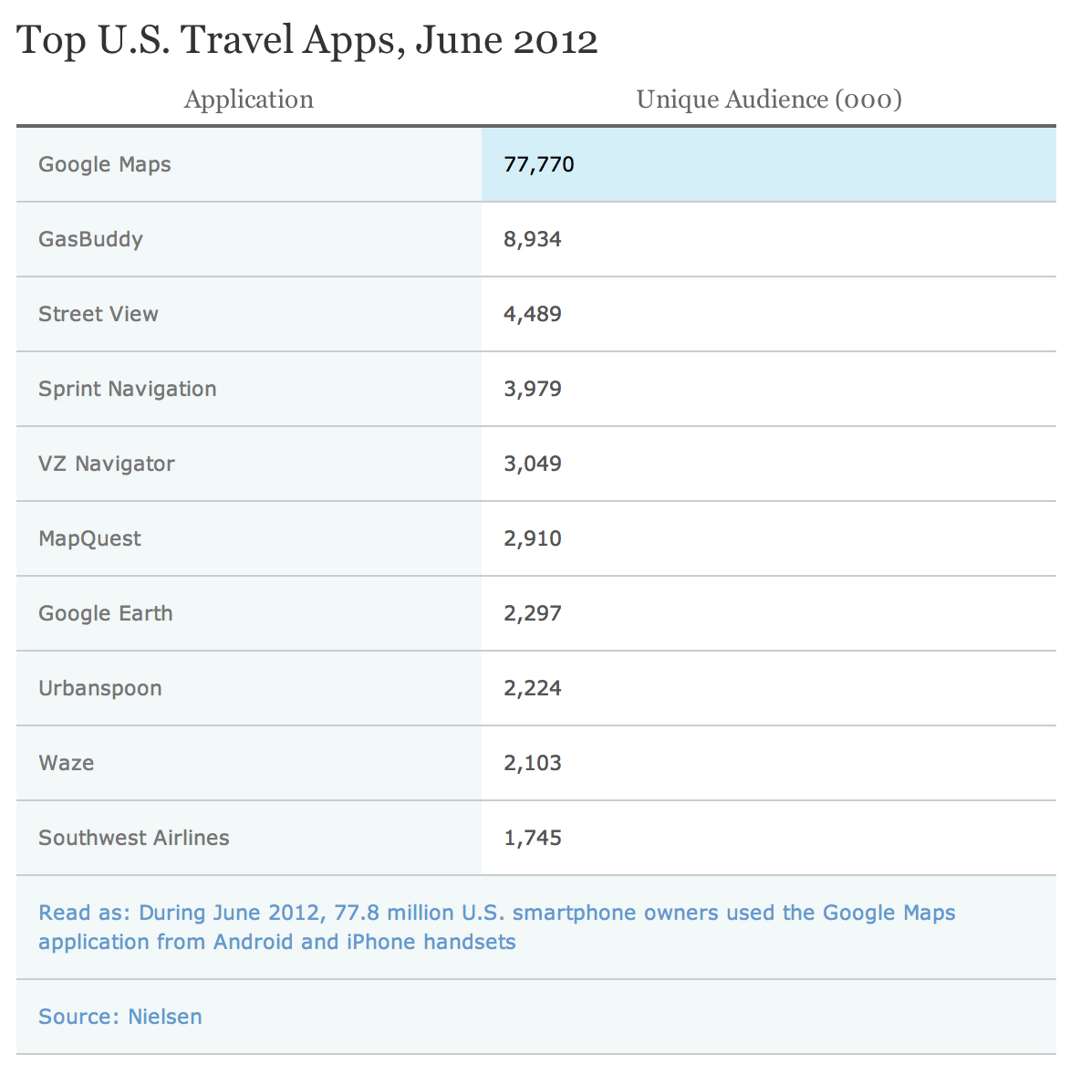 According to the latest Nielsen survey, Google is dominating the Travel Mobile Apps usage space, which in turn represents 95 percent of travel smartphone usage (the other 5 percent being mobile web usage—which Google also dominates). The numbers below show Google’s Maps app on both Android and iOS (to be clear the Maps app on iOS is built by Apple and pre-iOS 6 uses Google’s map tiles).