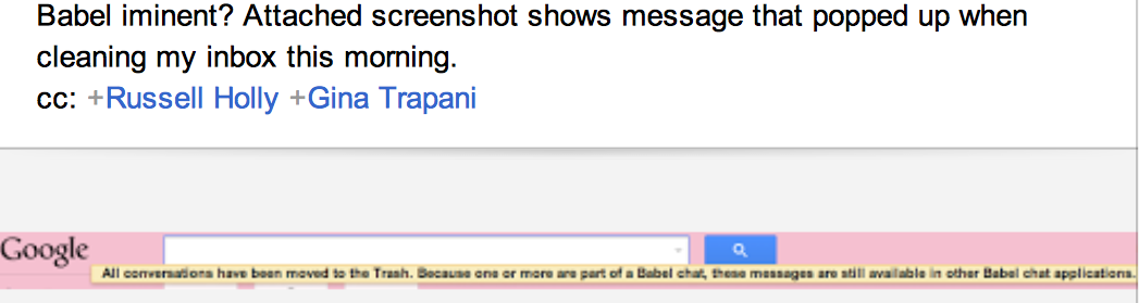 An increasing number of references to Babel/Bable/Babble have been spotted, for example in Google support messages (thanks, Roga Moore), but a reference in a current Google message suggests that it may be very close to launch – and that Babel may be the spelling.