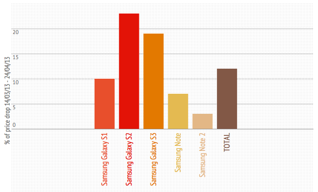 Although it’s a UK site, it’s likely there will be a very similar impact in the USA. Unsurprisingly, increased supply of older handsets on the market coupled to reduced demand as buyers eye the S4 drove down trade-in values across the Galaxy range, with a smaller impact on Notes.