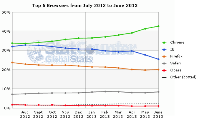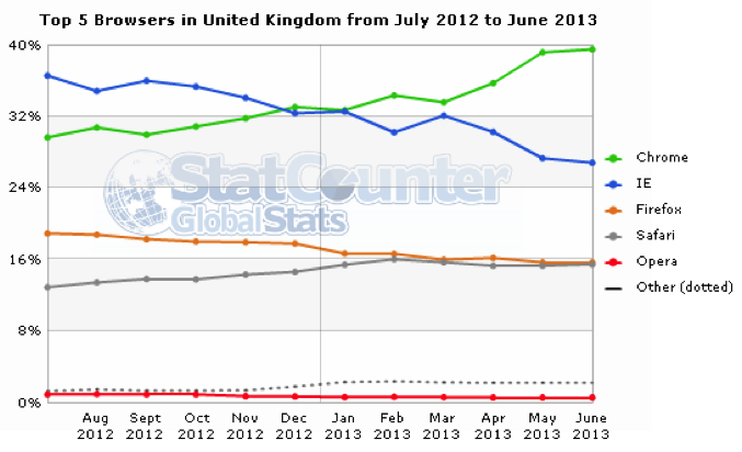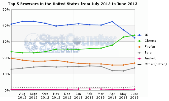 In the United States, IE lost the number one spot in terms of internet usage for the first time in June 2013. Chrome has now taken the number one spot in the US at 34.02% (up from 23.84% 12 months ago). Over the same time frame IE has declined to 32.46% (from 40.89%)