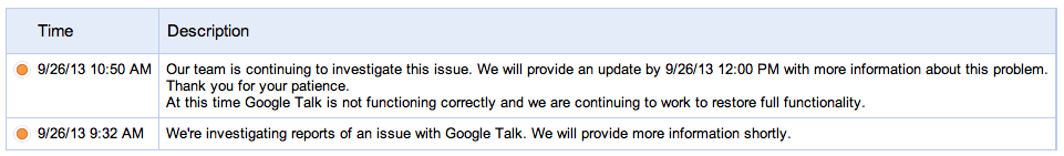 Update, Sept. 27: Some users are continuing to experience issues with Google Talk services today. Google says it expects “a resolution for all users in the near future.”