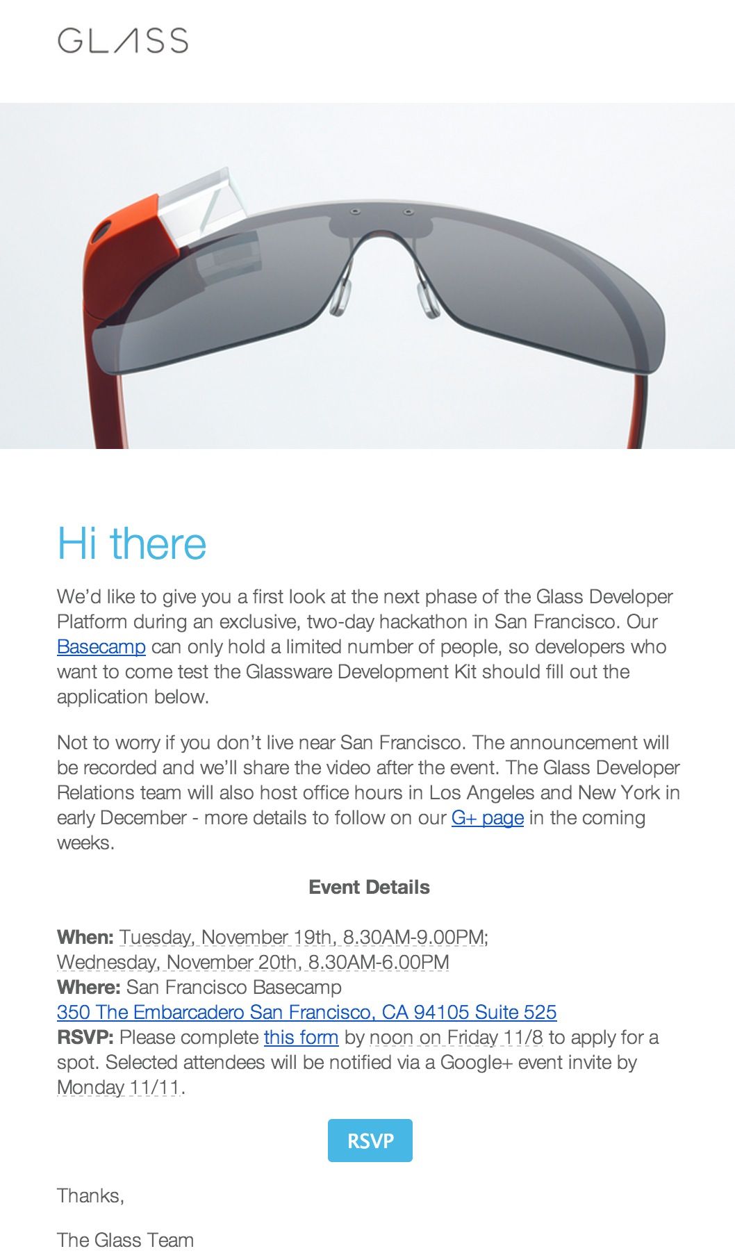 Google has just sent out invitations for developers to attend a two-day hackathon. The event will give Glassware developers a chance to see and test an upcoming release of the Glassware Development Kit. The hackathon will take place on November 19th and 20th at Google’s San Francisco Basecamp.