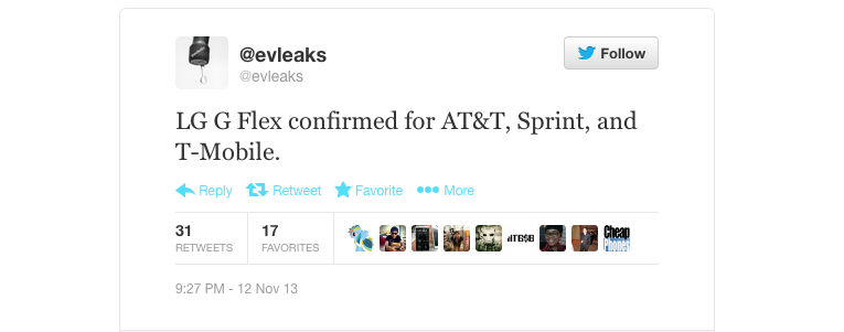 We’ve already had a fairly decent look at LG’s upcoming G Flex curved display smartphone thanks to a brief hands-on video and there’s no question the form factor is wild. Now, the device and it’s 6″ curved display is being teased for arrival on Sprint, T-Mobile and AT&T thanks to Twitter tipster @evleaks.