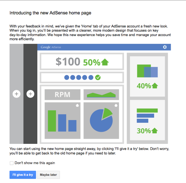 Google is rolling out a brand new AdSense home page look and it falls right in line with Google’s new “style.” The new landing page hints at a “cleaner, more modern design [that] focuses on key day-to-day information.” The new homepage is available right now with just a click of “I’ll give it a try” or you can pass and give it a go at a later point.