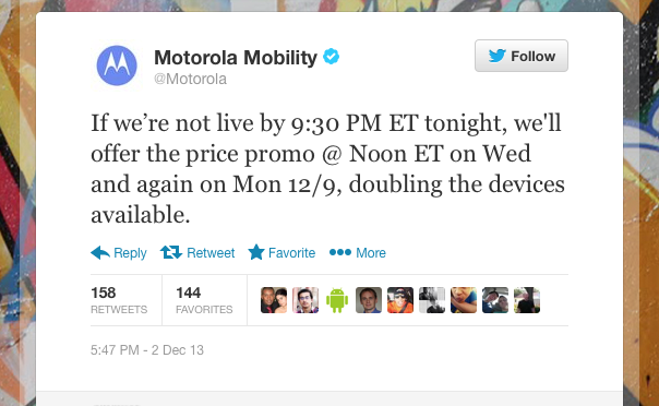 First, we misjudged the overwhelming consumer demand for Moto X, which was far greater than we expected.Second, our pre-sale site testing was not sufficiently extensive. Testing failed to reveal weaknesses caused by large volumes of concurrent orders flowing through the MotoMaker customization engine.Thus, when we opened the promotion this morning, an extraordinary spike in concurrent orders caused our website to go down. We couldn’t fulfill orders. The site became unstable. While some orders were filled, many customers tried all day to place their orders, unsuccessfully. Customers were left frustrated.We have since found a solution that we believe addresses the concurrent order issue. Motorolans are hard at work right now, implementing that solution.Here is what we are going to do: Starting at 12 pm EST/9 am PST this Wednesday, we will relaunch the $349 promotion. To help make up for this major inconvenience to shoppers, we will also add an additional promotional day on Monday, December 9. We will double the quantity of phones available, while supplies last, to allow as many people as possible to take advantage of the promotion. We’re also extending the 30% off offer on accessories to these two days.Please note that MotoMaker.com will open up for regular business tomorrow (Tuesday, December 3). We will stay the course on our regular sales as we restore our promotional prices for Wednesday and Monday.Stay tuned to our Twitter, G+ and Facebook pages for more updates. We understand people want frequent communications from us so we will do a better job at keeping you informed.On behalf of all Motorolans, I apologize for what occurred today. I appreciate your understanding as we get this fixed in time for Wednesday and Monday.Posted by Dennis Woodside, CEO