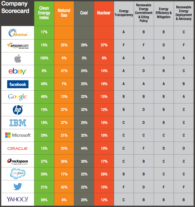 As Business Insider points out, Google has ranked quite well in Greenpeace’s “Clicking Clean: How Companies are Creating the Green Internet” study. Google scored an “A” in ‘renewable energy deployment & advocacy’ and a “B” in ‘energy transparency’, ‘renewable energy commitment & siting policy’, and ‘energy efficiency & mitigation’. Facebook and Apple both averaged well in the same categories, while Amazon, Microsoft, and Twitter all scored poor to dismal ratings in each category. Full report card below: