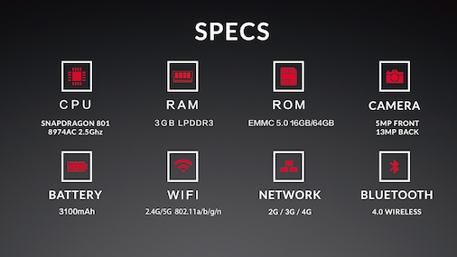 The OnePlus One packs a 5.5-inch LTPS IPS with TOL 1080p display, 2.5GHz quad-core Snapdragon 801 processor, 3GB of RAM, 3,100mAh battery, a 5MP front-facing camera, and a 13MP rear camera. The device has a magnesium frame, giving the device a total weight of 162 grams. OnePlus claims this is the “lightest 5.5-inch phone in the world.”