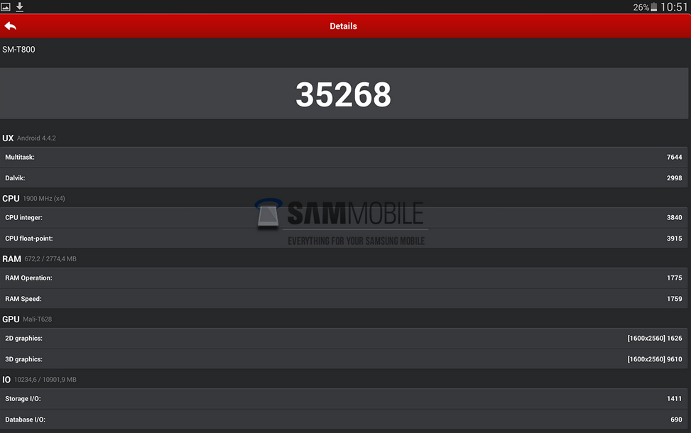 In addition to revealing the Galaxy Tab S’ name and specs, SamMobile’s source shared a purported screenshot tablet’s Antutu benchmark score, which pulled down an impressive 35,268.