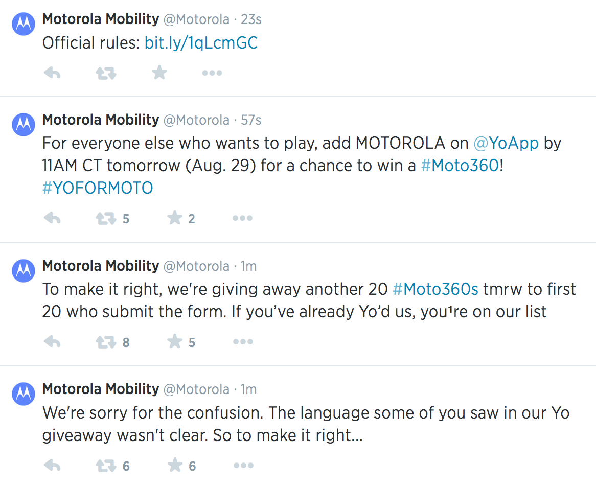 Update: Motorola has responded to the complaints via Twitter and is going to “make it right” by giving away 20 more Moto 360 smartwatches. The rules are exactly the same. Motorola will send a Yo to participants at 11 a.m. CT on Aug. 29, 2014. If you’ve previously entered the contest, you’re already entered into this one.