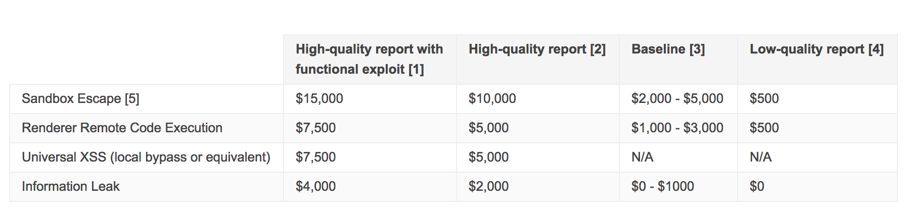 As for the new rewards, Google is increasing the maximum $5000 payout for bugs to $500-$15,000 per bug. Google has details about what rewards it pays for specific but types here, but it points out that it often pays more than the maximum: “As always, we reserve the right to reward above these levels for particularly great reports. (For example, last month we awarded $30,000 for a very impressive report.)”