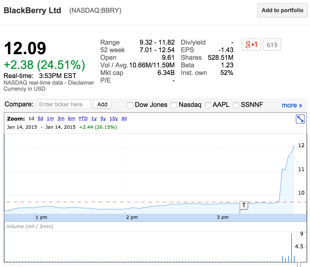 Blackberry stock skyrocketed Wednesday afternoon after a report that the device maker had been approached by Samsung about a potential takeover… At its high, Blackberry was up more than 21 percent… South Korea’s Samsung proposed an initial price range of $13.35 to $15.49 per share, which represents a premium of 38 percent to 60 percent over BlackBerry’s current trading price, the source said.
