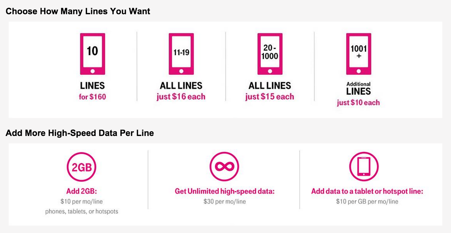 As for new business plans, T-mobile announced what it’s calling “Un-carrier for Business” with new plans and more transparent pricing compared to the other guys. The new plans, T-Mobile’s CEO John Legere says, will save a family with two lines around $875 over two years versus AT&T and Verizon. Here’s what they look like: