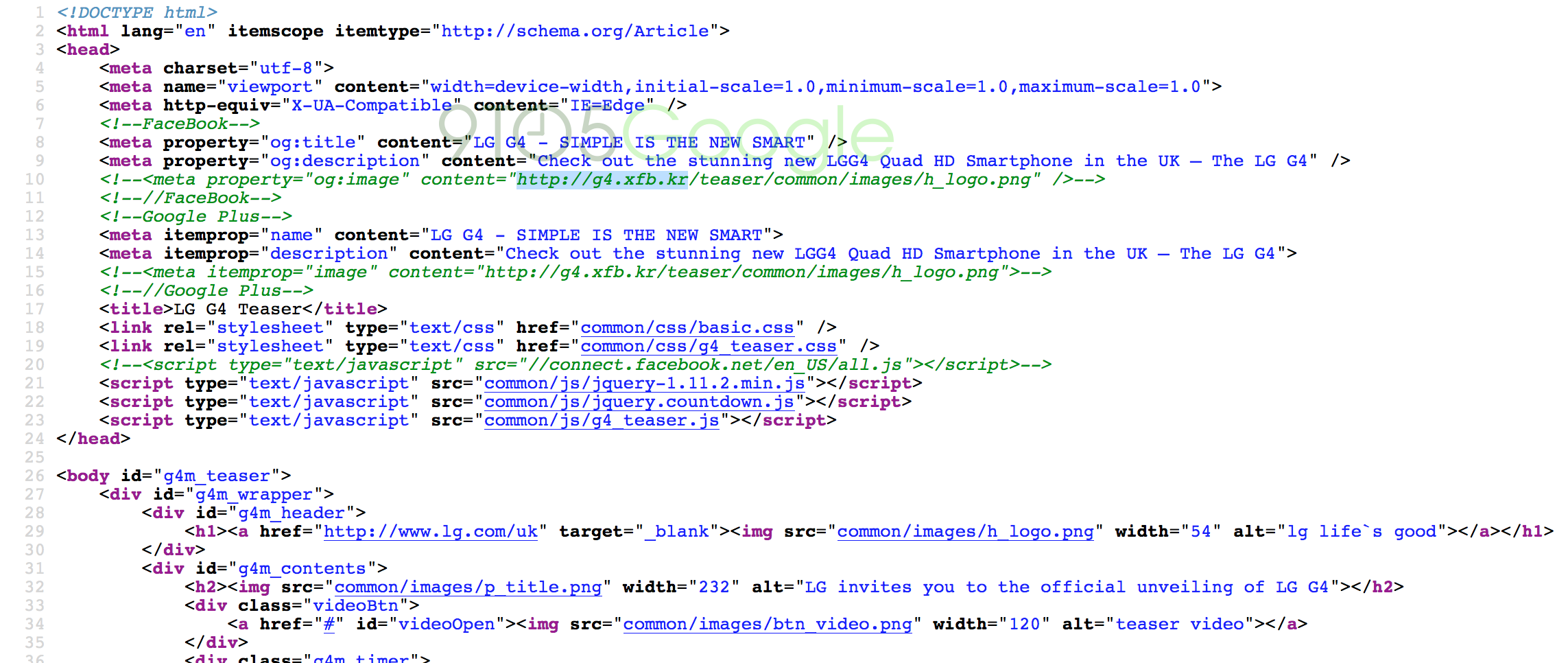 The site provides detailed information about LG’s upcoming flagship. The specifications shown on the site are the G3’s (given away by the Android 4.4.2 mention and the camera specs), but it’s likely that some of those are just a placeholder for the real deal upon announcement. This micro site could be under construction at the moment, but what’s even more interesting is how it was discovered. Apparently, LG’s source code on this page had a URL string which at its base URL directs to the micro site. See the source code and URL highlighted in the image below.