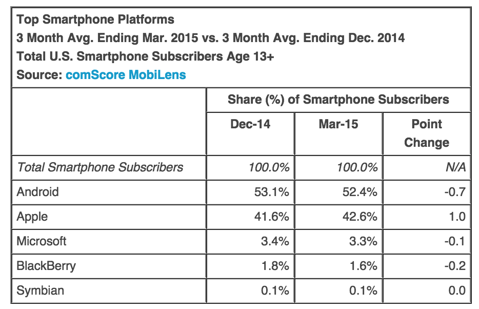 comScore today released a new U.S. smartphone manufacturer and platform market share report for the three month period ending in March. The data suggests that while the continued strength of iPhone 6 adoption has resulted in market share gains for Apple, Android is still the most popular smartphone platform in the United States.