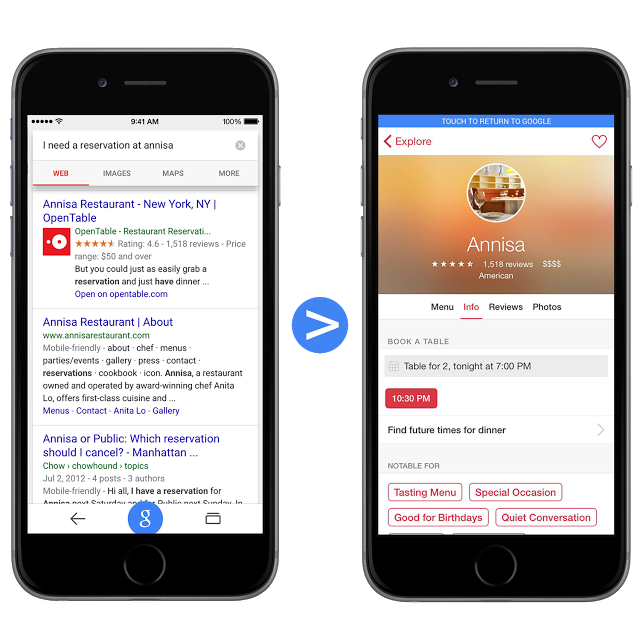 Now if a user is searching Google to get a reservation to a specific restaurant and OpenTable can book it, for example, clicking the link in Google Search for iOS may bump the user over to the restaurant’s information page in the OpenTable app so long as they have it installed.