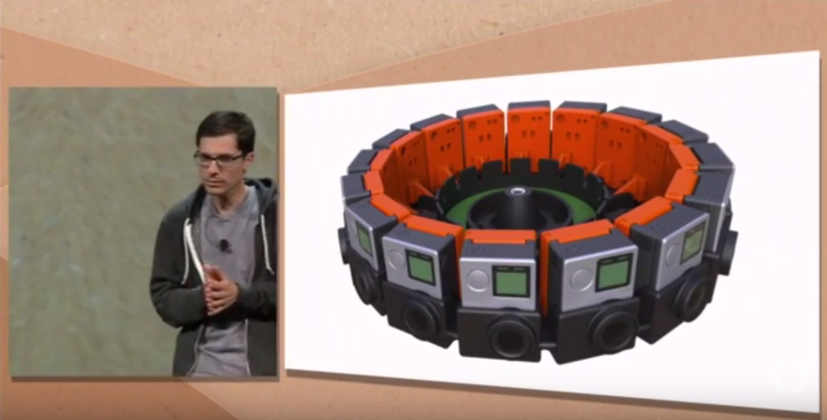 The camera rig itself that Google devised is comprised of 16 different cameras mounted in a circular array. The company says you can make the array that the cameras are placed into yourself with a range of materials –they say plastic, metal, and cardboard worked fine for them – but what really matters is the actual geometry of the rig which includes every detail from the size of the rig, the size and placement of each camera, the field of view, relative overlap, and a handful of other measurements. Google says that, just like Cardboard VR, the company will be open sourcing all the mathematics around how to make the perfect rig this summer so anyone with the motivation will be able to build it themselves. For those who don’t feel like doing all this work, they are working with GoPro to release a VR camera built to the Jump specification, although they didn’t say on stage when exactly it’ll be available for purchase. Below is a picture of what that rig will look like.