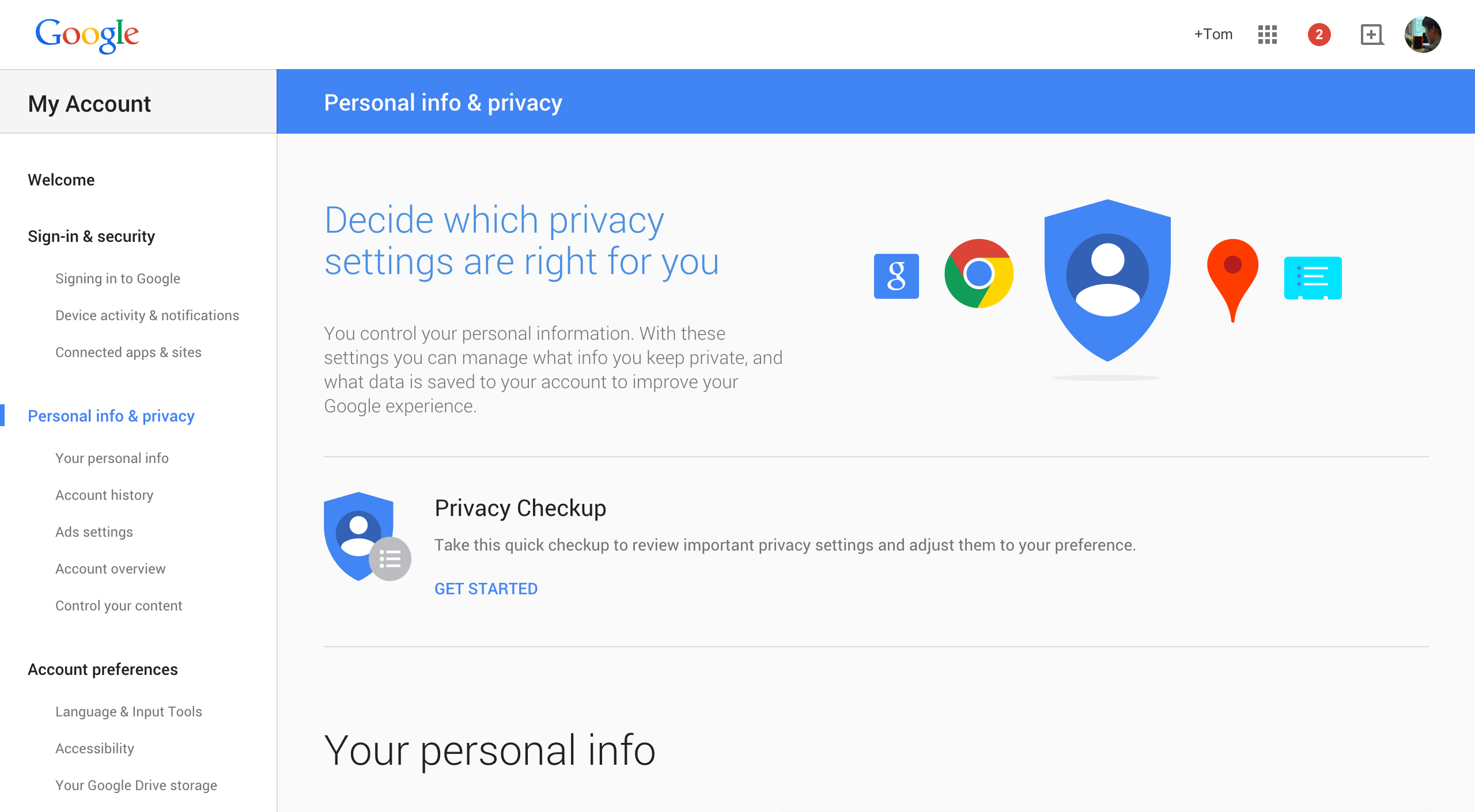 Here’s what it looks like when you click in to view everything under “Personal info & privacy,” again noting the large headers and brief descriptions that explain everything in clear, simple language: