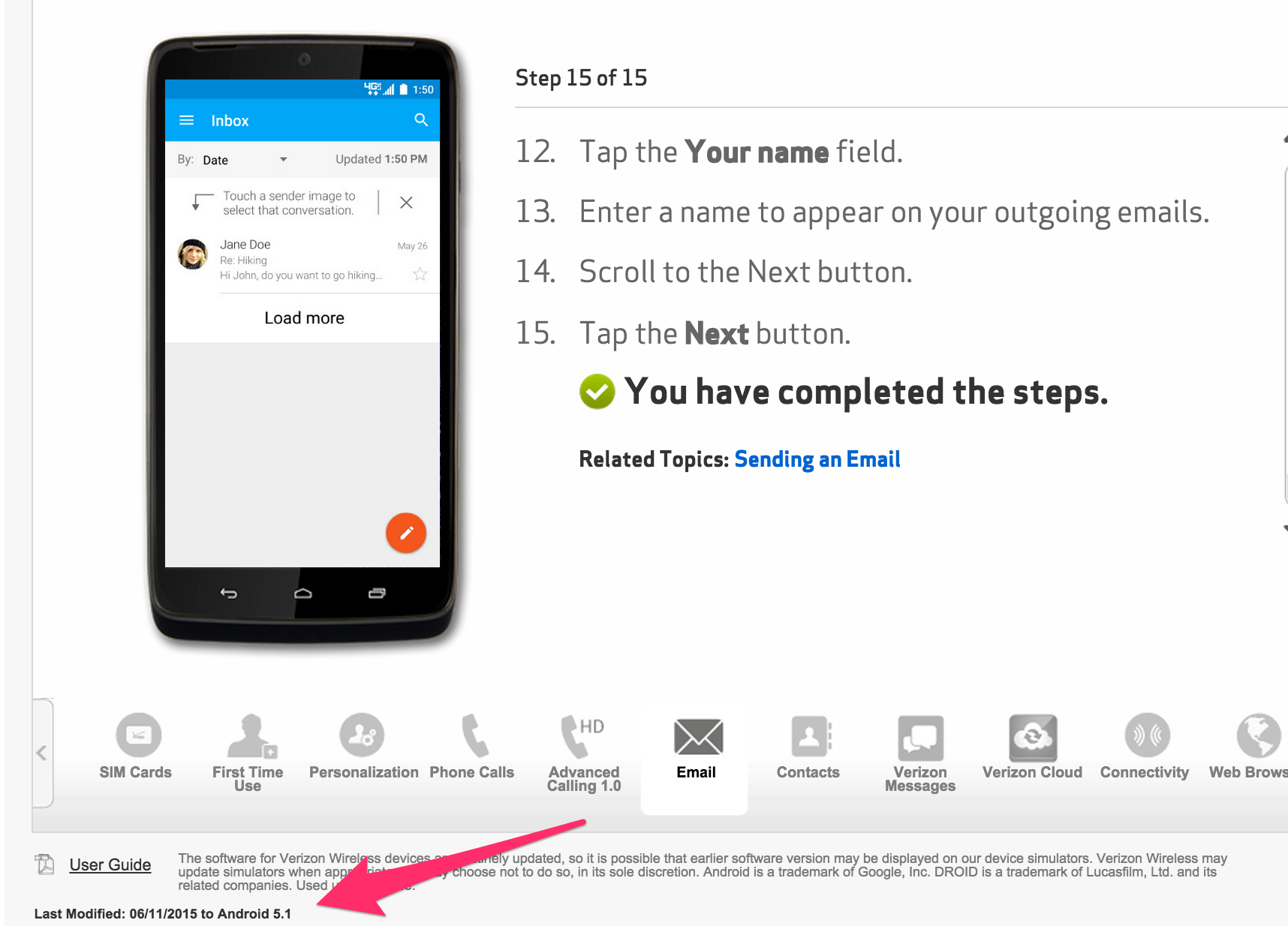 Verizon Wireless provides online simulators for many of its smartphones which seek to help new customers learn how to use their new device and set up things like their contacts list and email accounts. As you’ll notice in the bottom left-hand corner of the image below, it clearly states that Verizon updated its simulator for the Turbo yesterday to reflect an update to Android 5.1, even though the phone has not, in fact, been updated to that version of the OS. The phone in the simulator is clearly running a version of Android Lollipop, with all its trappings like the pull-down notification menu and white app drawer icon, that has been modified to include Verizon’s pre-installed carrier and DROID-specific apps. Whoops.