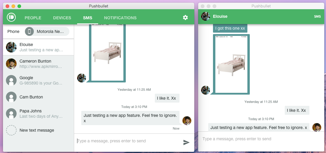 If you want to have multiple conversations open up at once, you can have them in separate pop-up windows on your desktop. Pushbullet just got a ton more useful and will render apps like MightyText useless now that the texting experience matches that on your phone.
