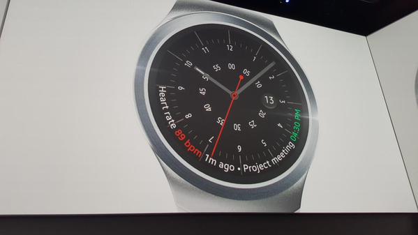 As had been rumored previously, the new smartwatch is going to be round and feature a mostly metal casing. From the brief look at the user interface, it seems almost certain the company will opt once more to go with its own Tizen operating system rather than use Android Wear. It shows a clear focus on health and fitness in the photo above taken by @michaeljosh on Twitter. Another screen grab (below by @vquinn) shows a really classy looking analogue style watch face, with heart rate information and an upcoming calendar event.