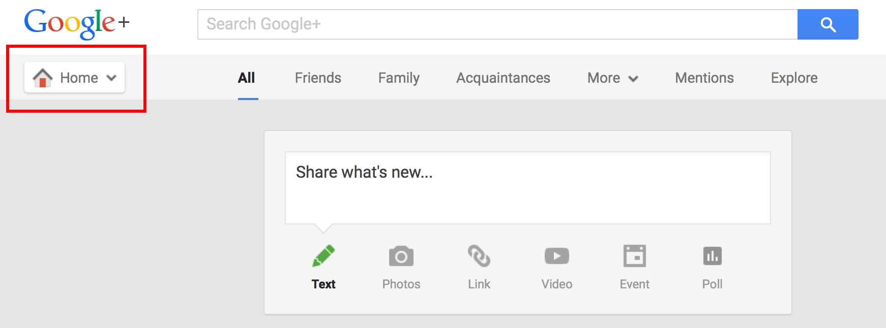 Go to http://plus.google.com and click on “Home” in the top left corner.