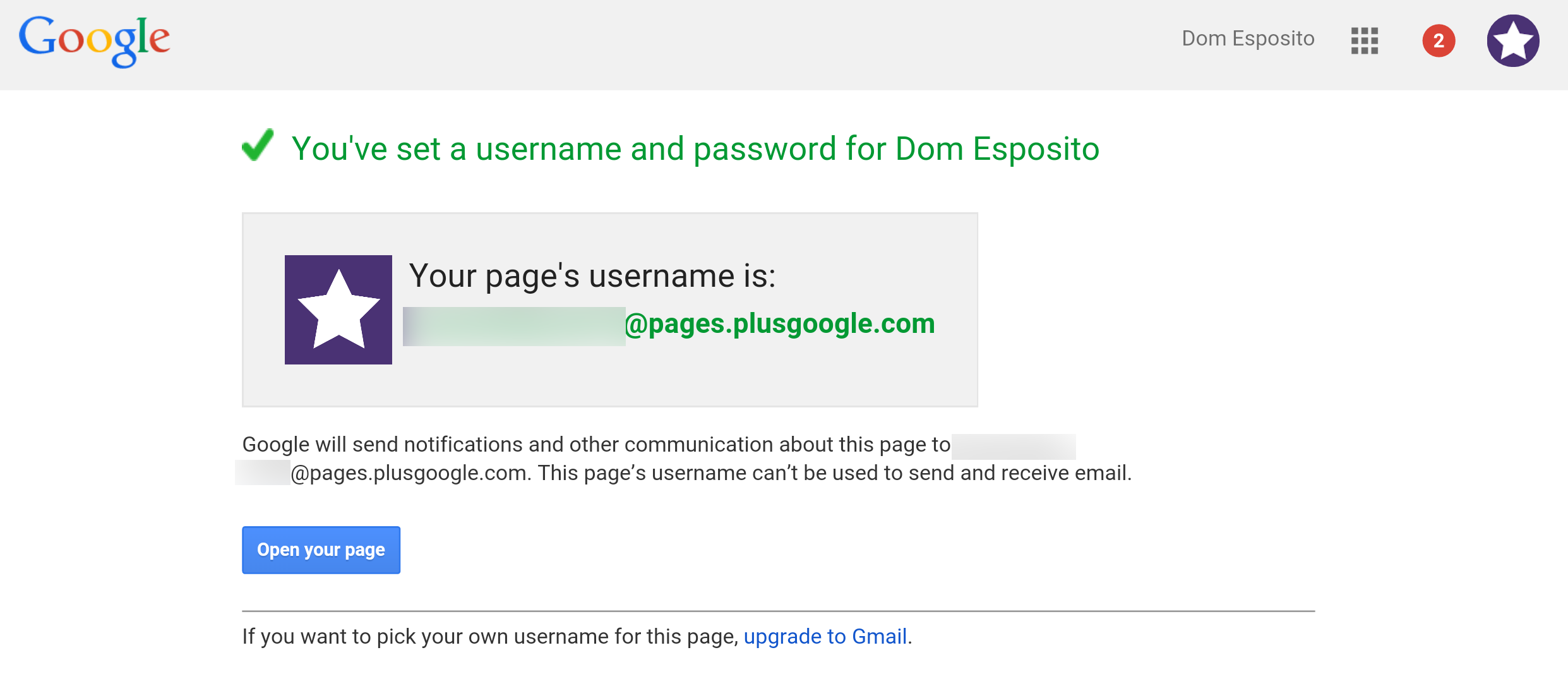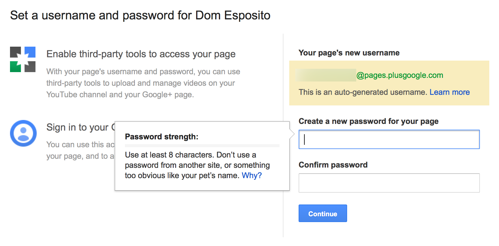 The next screen will prompt you to create a password for this random Google Plus Page address.