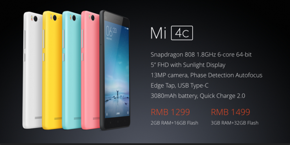 Xiaomi’s Mi 4c will ship in white, black, blue, pink and orange and will be available in two different storage and memory options. The lowest-priced version has 2GB and 16GB of storage and costs ¥1299 (roughly $205), or you can pay ¥1499 ($235) and get a device equipped with 3GB RAM and 32GB storage. The device weighs just 132 grams (0.3 pounds), and measures in at just 7.8mm thin. As you’d expect, the device features Dual SIM LTE support as standard.