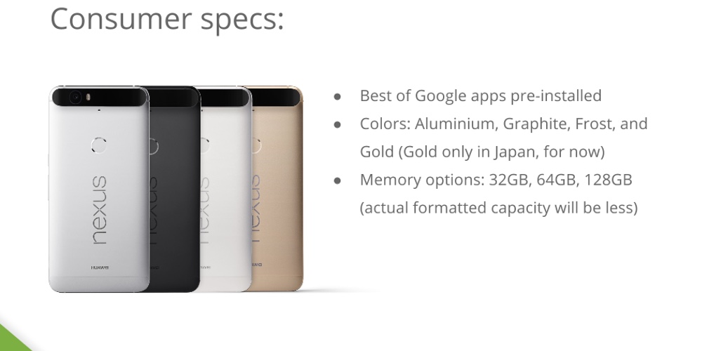 Corroborating previous leaks and rumors, the presentation features an all-metal device with a slight hump on the back where the camera is housed. A recent leak showed four colors for the Nexus 6P, and this presentation adds further credence to that leak. In most markets, we’ll see three colors: Aluminum, Graphite and Frost. Huawei is also building a gold model which will only be available in Japan to start. It also looks like rumors of having 32GB, 64GB and 128GB storage options were correct.